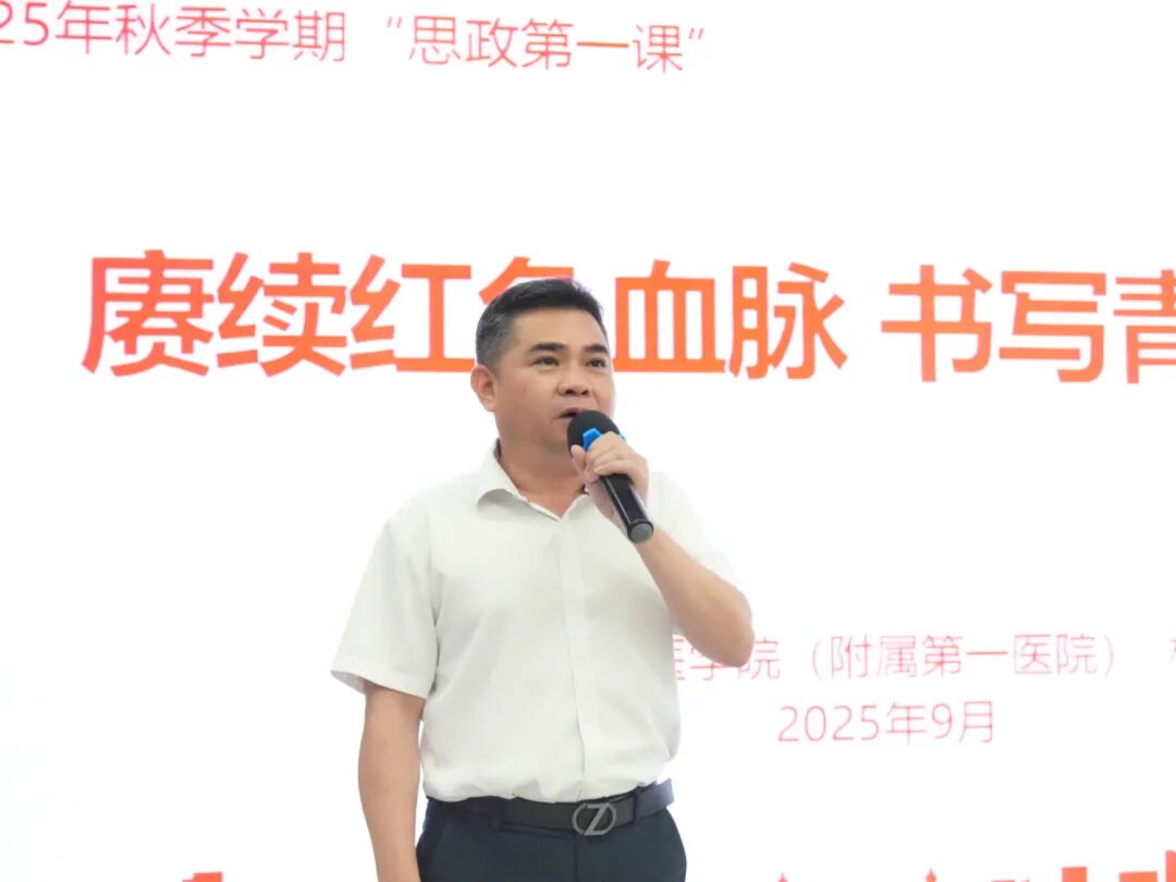 林伟成以“赓续红色血脉,书写青春答卷”为主题,为新生们上了一堂深刻而生动的思政第一课。他首先围绕“弘扬伟大抗战精神,赓续红色血脉”,为同学们详细阐述了纪念中国人民抗日战争暨世界反法西斯战争胜利80周年大会的精神内涵与重要意义。他表示,作为广药大临医学子,应该厚植家国情怀,涵养进取品格,把个人发展融入民族复兴的伟业之中。