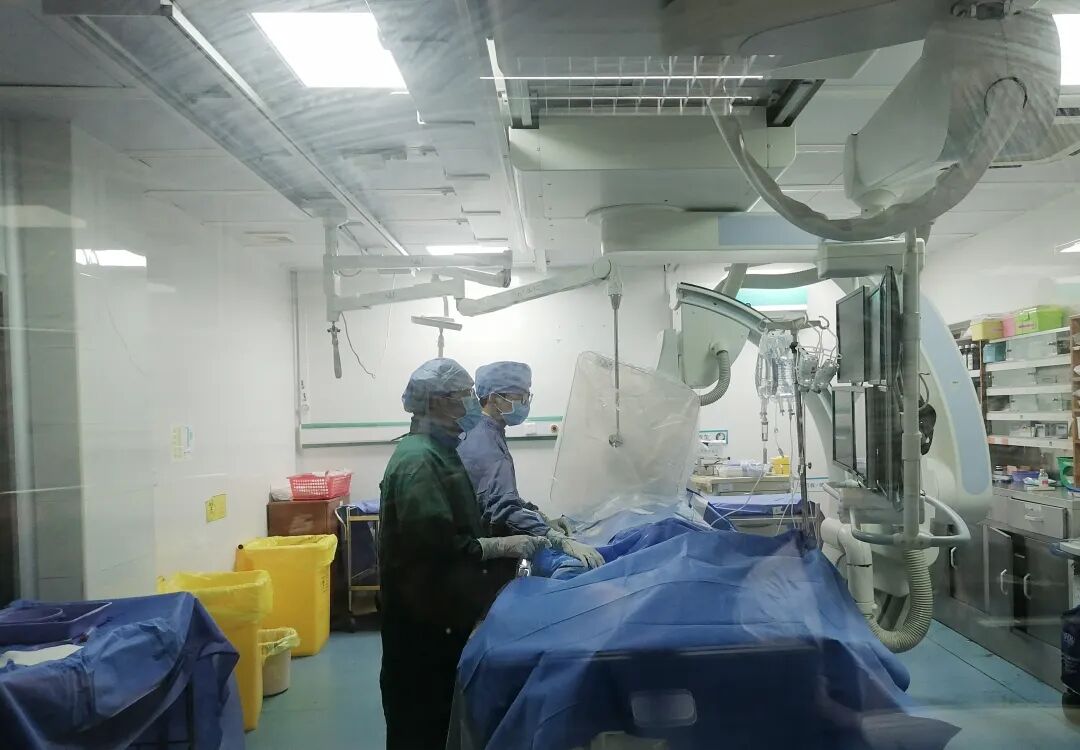 在副院长曾智桓教授指导下,郑坚奕副主任医师紧急施行冠状动脉造影,发现患者左前降支近段急性闭塞,导丝成功通过冠状动脉闭塞处,血栓抽吸、球囊扩张、支架植入,一气呵成,血流恢复通畅!