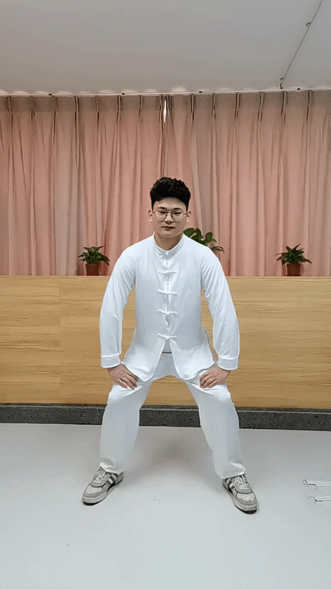 马步蹲桩时膝盖不超过脚尖,拉弓手「八字掌」虎口撑圆(刺激合谷穴) 。