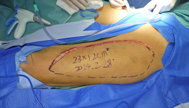 手术过程中,设计足够的范围,精准切除肿瘤组织,确保在安全切缘的前提下彻底清除病灶;切除肿瘤后创面缺损范围达到了18×14cm,在患者右侧大腿前外侧设计并切取一块23cm×12cm的游离皮瓣,包含皮肤、皮下脂肪及旋股外侧动脉降支血管。在高倍显微镜下,医生以 “穿针引线” 般的精细操作,将直径不足1.8mm的血管与臀部创面附近的血管进行吻合,重建皮瓣血运。