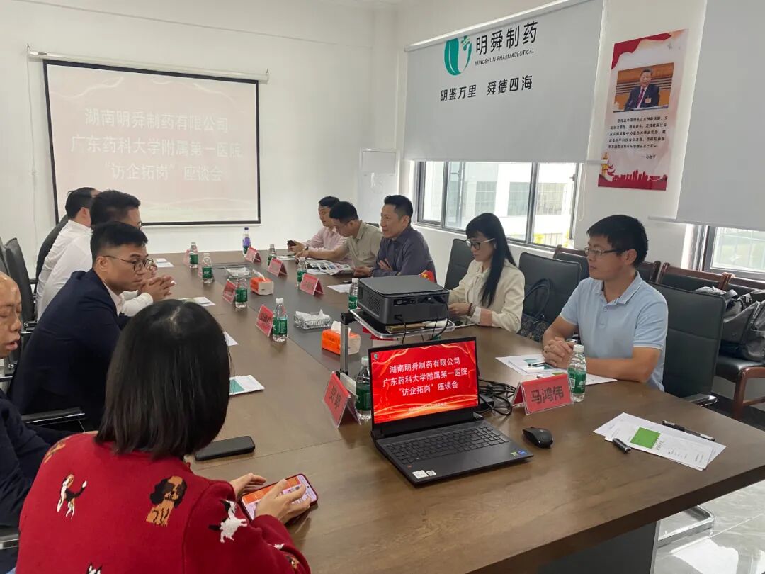 近日,广东药科大学附属第一医院党委副书记、院长许典双率团队赴湖南邵东县,与湖南明舜制药有限公司举办访企拓岗座谈会,围绕健康产业科研转化合作展开深度洽谈。明舜制药董事长曾昭明携团队热情接待,双方经充分交流,在多领域达成合作意向。