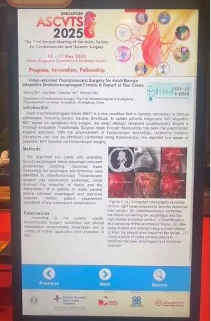 近日,2025亚洲心血管与胸外科年会(ASCVTS 2025)在新加坡隆重召开,全球顶尖专家学者齐聚一堂,共议学科前沿进展。广东药科大学附属第一医院心胸外科肖海平主任、朱启航医生团队的研究成果《Video-assisted Thoracoscopic Surgery for Adult Benign Idiopathic Bronchoesophageal Fistula: A Report of Two Cases》(电视辅助胸腔镜手术治疗成人良性特发性支气管食管瘘:两例病例报告)在大会中作为专题展报精彩亮相。这标志着我院在复杂胸外科疾病诊疗领域迈入国际先进行列。