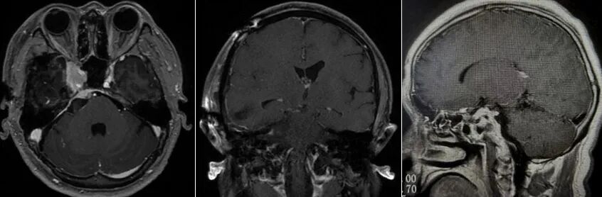 由于肿瘤侵入海绵窦,为了避免术后造成患者眼睑下垂、眼球运动受限、视力障碍等严重的颅神经损伤后遗症,术中残留了少许肿瘤,日后辅以放射治疗予以消除。术后,患者未出现神经功能障碍,颜面部疼痛症状也消失了。病理报告“脑膜瘤,WHO 1级,皮细胞型”。经过短期治疗后,患者顺利出院。