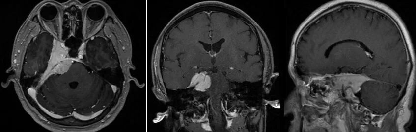 本例患者是一例岩斜区海绵窦脑膜瘤患者,该区域位于岩骨与斜坡的交界地带,毗邻后颅窝与中颅窝的过渡区,堪称颅内最复杂区域之一。这类肿瘤经常向内侵犯颈内动脉虹吸段、动眼神经(Ⅲ)、滑车神经(Ⅳ)、三叉神经(Ⅴ)分支及外展神经(Ⅵ),向后方生长影响面神经(Ⅶ)、前庭蜗神经(Ⅷ),甚至压迫“生命中枢”脑干腹侧。